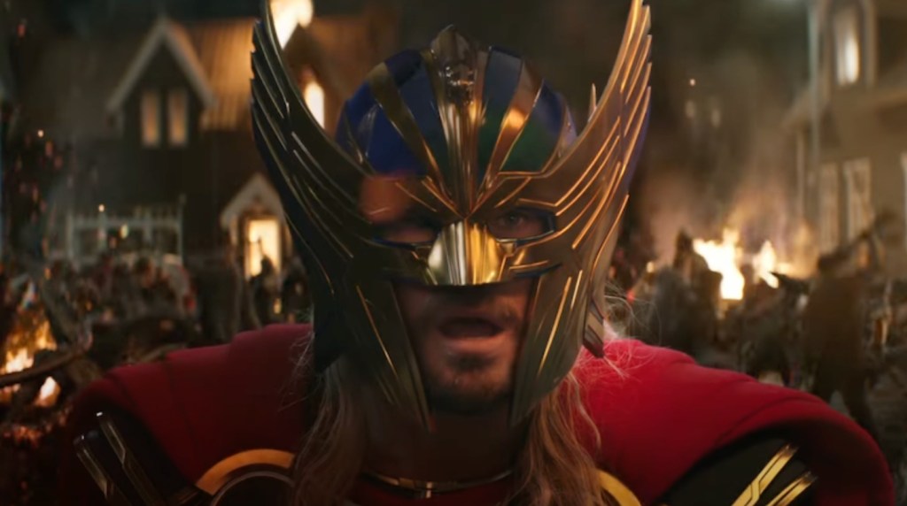 While some have already pointed out similarities to either Lord Voldemort or the Addam’s Family’s Uncle Fester, there’s no denying that Christian Bale’s sinister do-badder has a creepy knight from the Crusades meets Nosferatu look that lends itself well against the colours the rest of the film is pumping into your eyeballs. Is he a comic accurate Gorr? No, he is not. But he’s still a noticable threat as he wields his sword (possibly All-Black the Necrosword) in his quest to rid existence of any and all gods in his way. Plus, it’s giving the director some funky looks to play with as a battle sequence seems to be set in a place where colour struggles to form and is nicely reminiscent of the impressive cinematography from the Hela vs the Valkyrie flashbacks from the previous film.