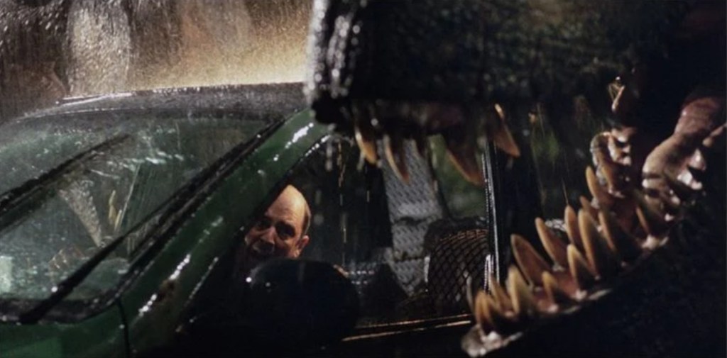 From here we are presented with a sequence where the two dinosaurs rip Eddie’s vehicle to pieces around him while he has no choice by to stay put and keep his foot on the gas a d eventually, the wannabe hero is wrenched from the wreck and torn in two. Ever for a franchise that’s got a rep for being pretty cruel to its supporting cast, this one is pretty cold blooded as Eddie’s sacrifice has him as the spaghetti as the two Rex’s use him to homage Lady & The Tramp in the absolute worst way possible.