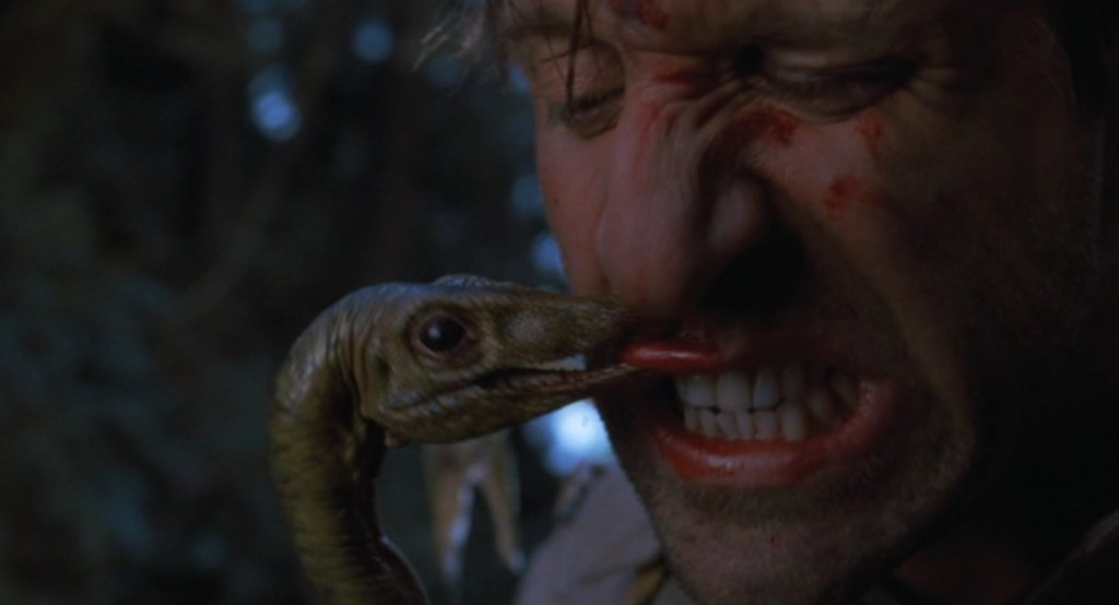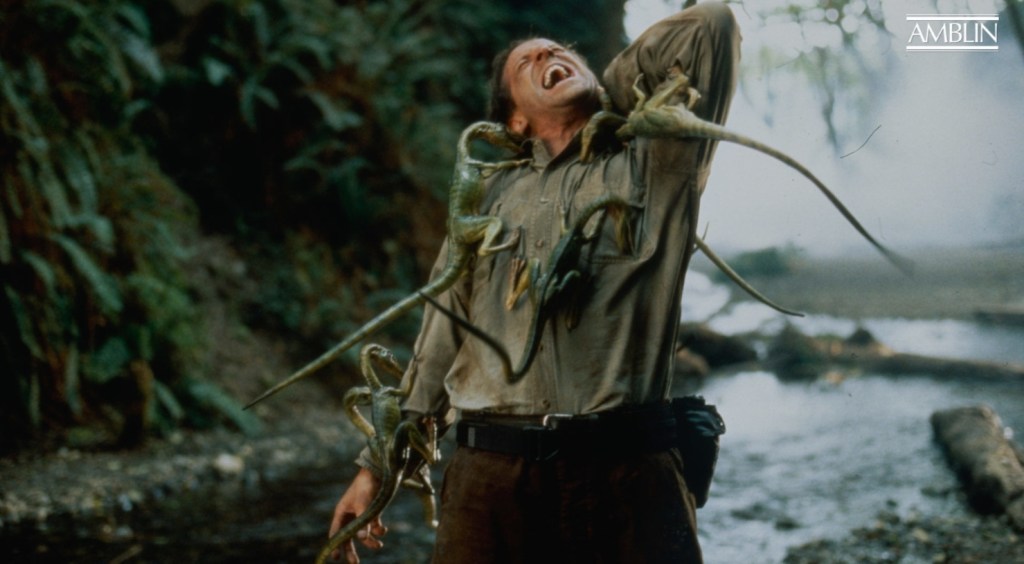 Usually, when a character tags out early in a Jurassic Park flick, it’s because some poor soul has wandered into the path of a bloody great lizard that’s noticably bigger than them. However, on The Lost World, that cheeky innovator of the truly hideous PG death known as Steven Allan Spielberg decided to keep things varied by taking the odious, wood chipper using Gaear Grimsrud from Fargo and having him picked apart by tiny, ravenous, murder lizards.