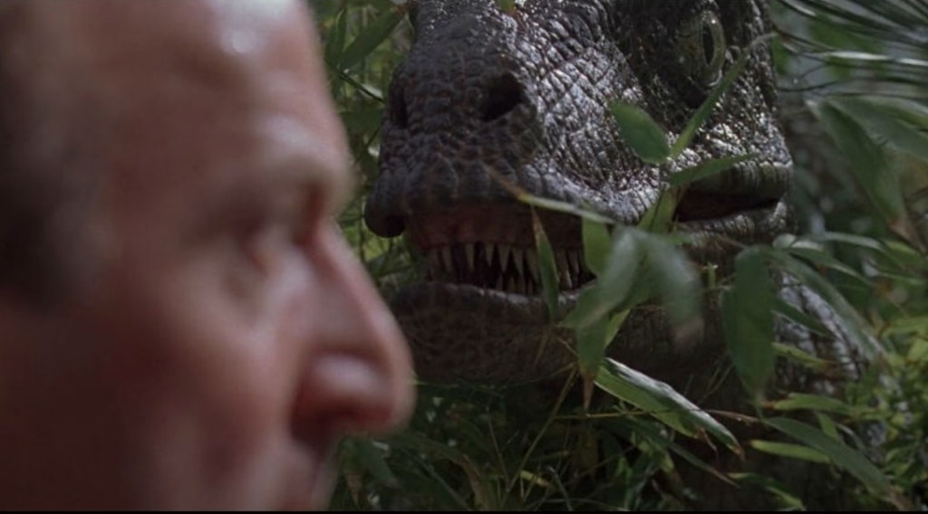 The Jurassic franchise has been a brand leader in bowel flipping, “oh shit” moments since the second the first movie spooled through a projector and the moment that that scaley snout peeks through the foliage may rank as the best.