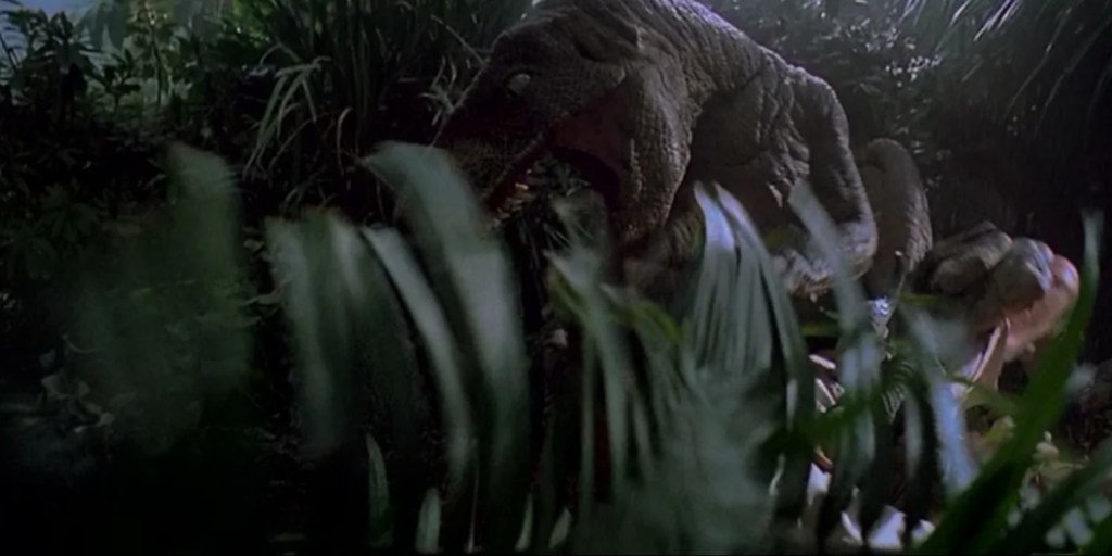 We’ve seen Jurassic Park’s mascot species crunch down on victims before and we’ve seen her do it since, but what makes this particular instance of traumatic swallowing so memorable is the stupidly tense hullabaloo that leads up to it.