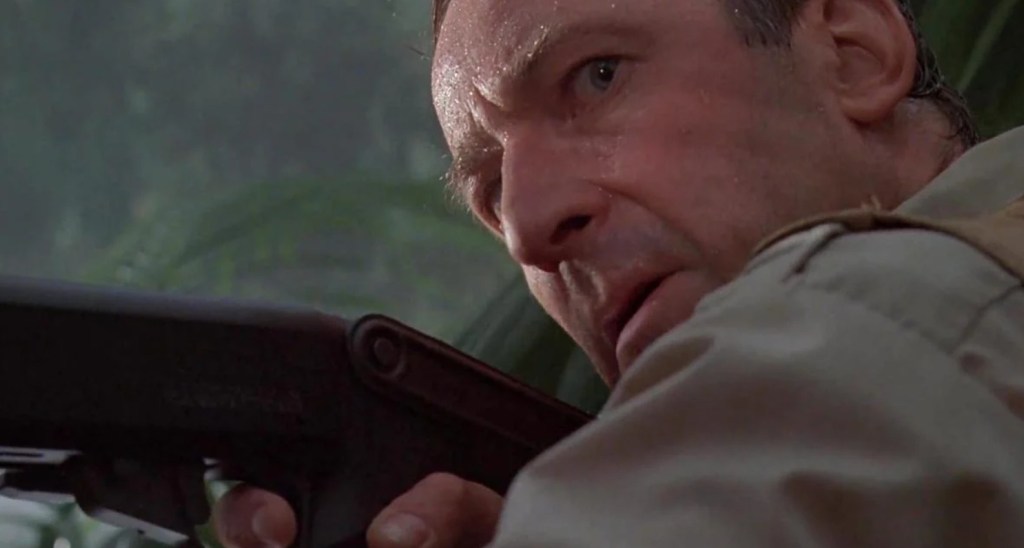 Trapped out in the open with Raptors lurking somewhere in the jungle like shifty teenagers, Muldoon tells Ellie Statler to make a break for it, thinking that he’s managed to spot one of the creatures hiding among the leaves. “I’ve got her!” he whispers as he slowly creeps toward his prey as he unslings his shotgun, blissfully aware that thanks to that earlier monologue, we know exactly what’s about to befall him and sure enough, as he draws a bead on the overgrown death-gecko, out pops another Raptor that he didn’t even know was there. He has just enough time to utter a single, deeply iconic line (“Clever girl…”) before the claws of the beast drives home just how badly he’s fucked up and as his death is just obscured by branches, his blood-curdling screams are observed by the first Raptor, who sits there like the smug little bitch she is.