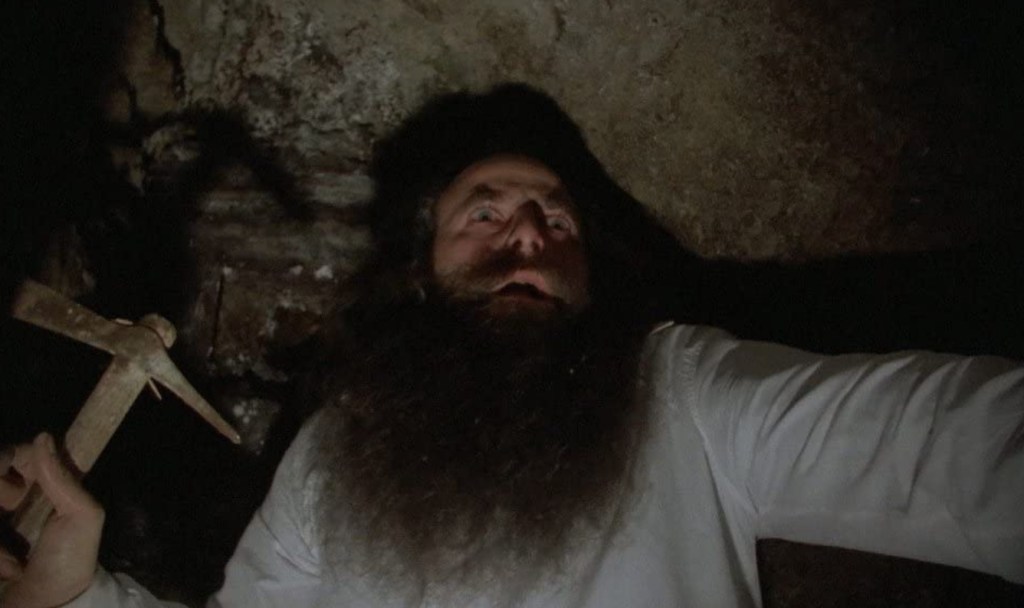 First off, while Italian zombies are particularly easy to spot due to the fact that their noticably slower than their American brethren, the Bural Ground zombies move like they’re on strike or something as they don’t so much stalk their victims as simply loiter about the place like drunks in a city centre at about 3 in the morning. Still, despite their lethargic hunting methods, they somehow still manage to run rings around their prey, managing to remove the head of a particularly careless maid with a scythe as she pokes her head out of a first floor window to see if the coast is clear. Bug eyed, coated in maggots and worms and featuring dental work that resembles a smashed piano, these lumpy headed flesh eaters lumber around in broad daylight and are about as threatening as roadkill and half as pretty – but they’re far more endearing than the parade of perverts, idiots and non entities that make up the human characters. Immediately as appealing than having your ballsack waxed by an inebriated chimp, the men folk take an early lead in the race to be least appealing by spouting out thirsty dialogue like “You look like a little whore, but I like that in a girl.” or “You’re getting a raise from me alright, but it has nothing to do with money.” while the women counter by coughing up such weapons-grade nonsense as “I’ve always been terrified of the dead. I hope they leave us in peace!” and being unable to stay upright for any longer than 10 seconds the while getting persued. However, the crowing champion is the moment when one of their number suggests that they should let the zombies in just in case theres something else in the mansion they’re after (“We could stay out of their reach, they’re so slow!”) and to your genuine horror, his comrades acrually seem pretty cool with it – but even this moment of spectacular lunacy pales into insignificance in the wake of Burial Ground’s secret weapon. That of the legitimately creepy appearance of Peter Bark.