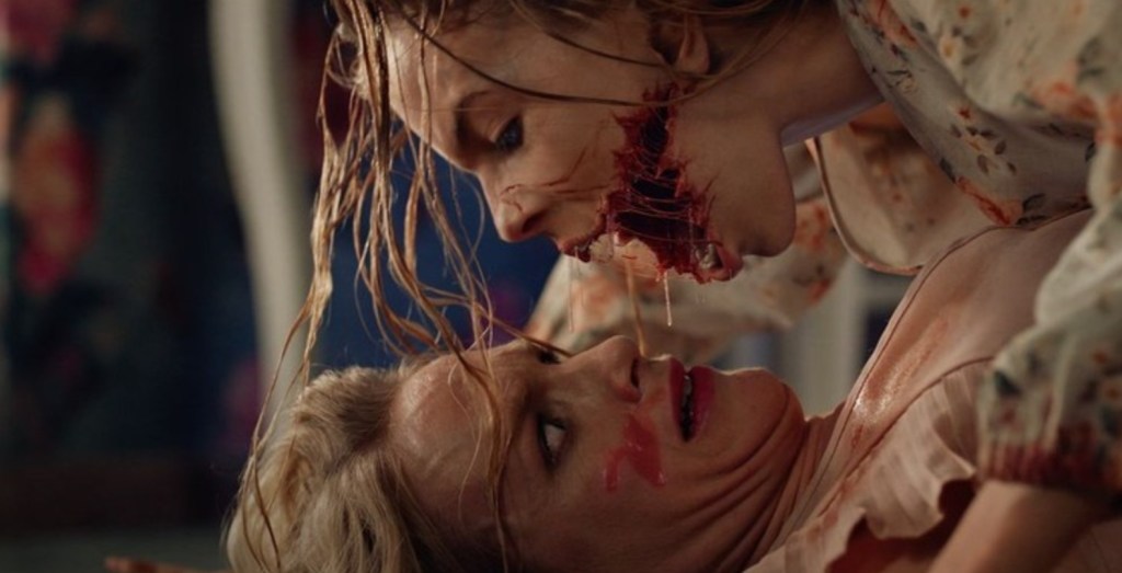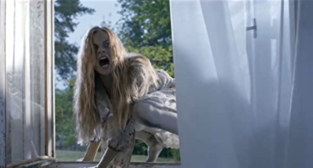 However, what we do have does the job nicely, with Siiri Solalinna handling the duel roles of the overwhelmed Tinja and the final stage version of Alli amazingly well considering she has quite the complicated role to play. When not internally chewing herself to pieces thanks to the incredible pressure of either having to live up to her mother’s online version of herself or try to keep the existence of her feather “child” a secret, Solalinna switches from a coiled spring of an adolescent to something more relaxed and motherly when attempting to care for the volatile Alli and thus create some sort of existence for herself. Similarly, all that gymnastics background comes on handy when she’s playing the hissing, scar-faced human version of the creature that, for some reason, her family instantly thinks is her. Also scoring high is Sophia Heikkilä as Tinja’s monstrously selfish mother who underplays the urge to go full “Mommie Dearest” and keeps everything seething under the surface until the occasion blow up has her beating her own face against a steering wheel in frustration. It’s all a thinly veiled poke at the kind of people who go to inhuman lengths to project a seemingly idyllic life on social media no matter whatever kind of metaphorical pipe bombs are exploding all around them in the day to day of their real life (not to mention the kind of tightly wound parenting that has folks treating their kids like a mini-me in order to vicariously reclaim some lost glory) and the direction manages to tweak that sort of unloosening, domestic tension nicely, but if Hatching has a problem it’s that its payoff feels a little soft boiled.