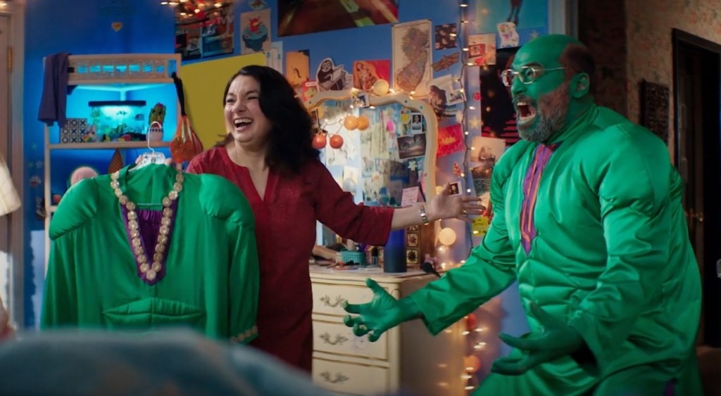 Giving us a garish eyeful the likes of which we haven’t seen since the opening credits of Edgar Wright’s Baby Driver, Kamala’s imagination bleeds onto the screen in the form of a spirited opening puppet show retelling the climax of Avengers: Endgame, or the sight of animated graffiti crawing up and the walls as she walks past to show her distracted grey cells in action. At one moment a text conversation is subtly conveyed by the neon signs on the side of a store and directors Adil & Bilall (Bad Boys For Life) go all out to bring a lush, hyper real, Into The Spider-Verse style visual language to fully convey their main character’s inner thoughts.