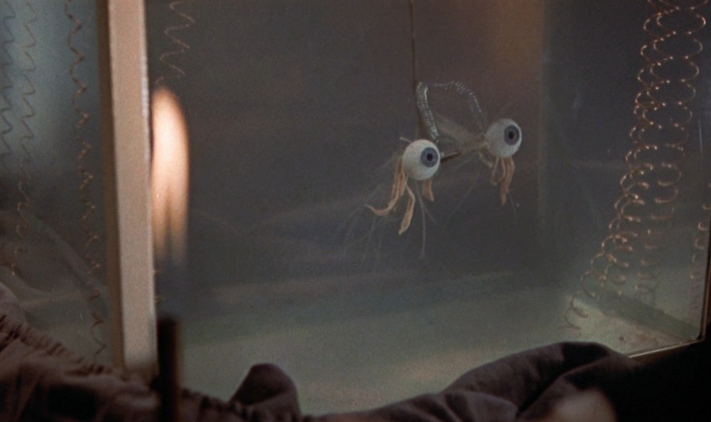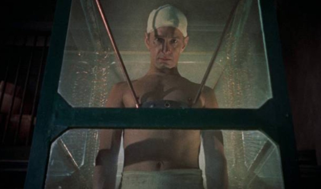 Cushing strides through the movie putting out vibes that he has absolutely no interest in anyone’s human rights or well being if it means he gets to screw with God’s plan just that little bit longer. His bizarre doodling with human parts that involves using a flame to freak out an arm and a connected set of eyeballs shows that despite his frosty, composed demeanor, he’s actually kaka for coco puffs, delivering lines loaded with underlining menace (“It would be a pity to lose you… so soon.”), terrorizing his poor patients with his chop-happy methods and working in a lab that has shocking health and safety standards – there’s a caged chimp within poo-flinging distance of the operating table for a freaking start!