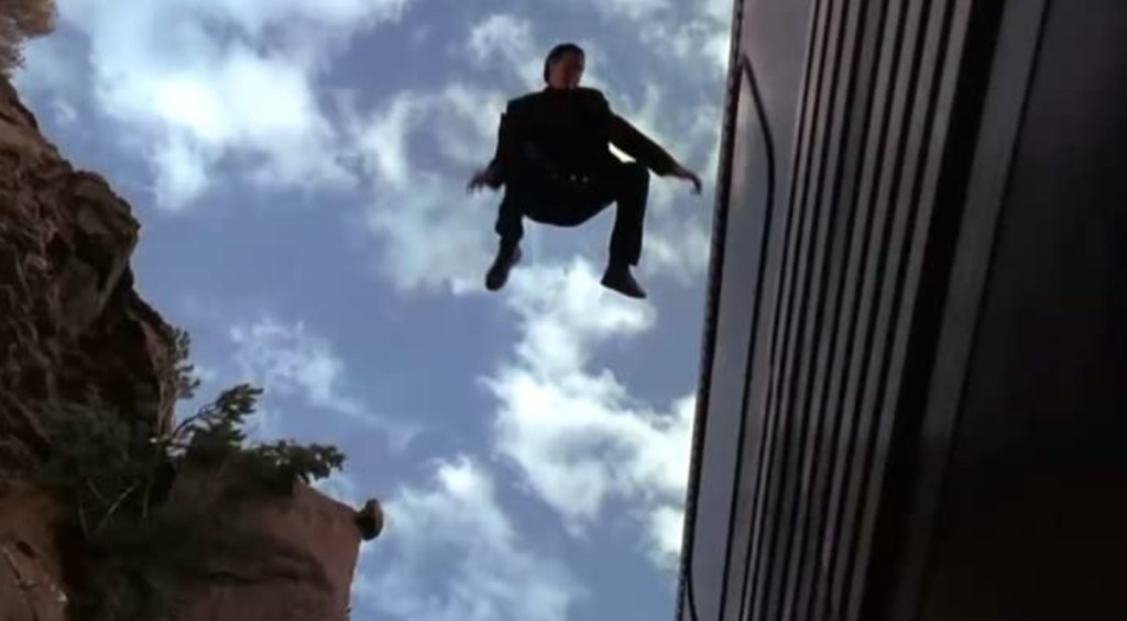 In this movie, a terrorist does not simply fall off the train and disappear under the wheels, oh no, the guy gets stuck in the cow catcher and is minced to death against the sleepers. You dont just get blown up by a booby trap left by the hero, oh no, you catch the bomb that’s thrown to you, have just enough time to see that the read out actually says “You’re fucked” and then the device explodes just enough to cover your upper body with sheets of flame until your boss puts you out of your misery with a bullet. You don’t get unhooked from a safety line while dangle over a cliff in this movie, oh no, Ryback shatters your face of the rocks first and then unhooks you as you tumble, screaming into the void. You see where I’m going here…