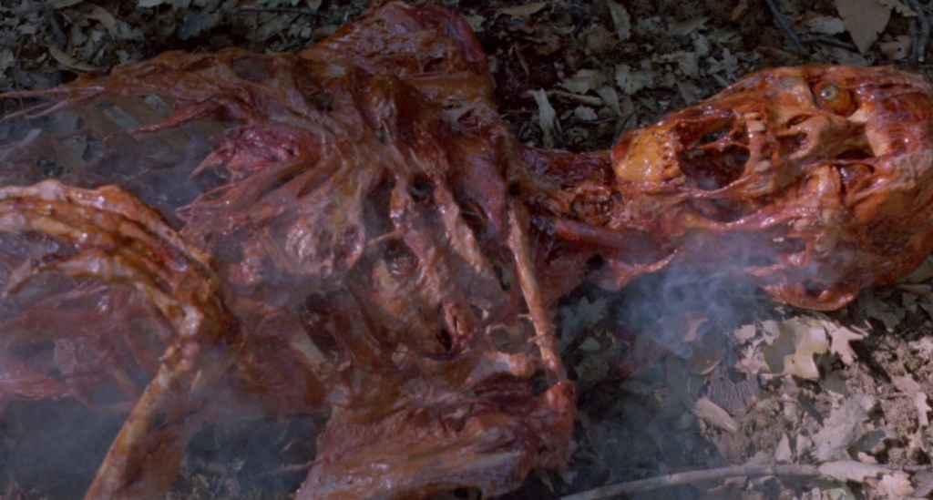 The movie runs through the usual scenes lifted from Predator, but shot through a metaphorical filter that makes everything 75% suckier – for example, remember that awsome bit when Schwarzenegger impales a dude to a post with a knife as says: “Stick around!”? Fucking great, wasn’t it? Now imagine the same scene but with Reb Brown doing the same thing and then blurting out “Don’t move!” to hilariously awkward effect and that’s just the start. The credits play the same with a shot of a cast member along with his credit, but the movie can’t even fucking do that right as some ridiculously awful spelling in the end credits lists our lead character as “Marphy” for some reason.