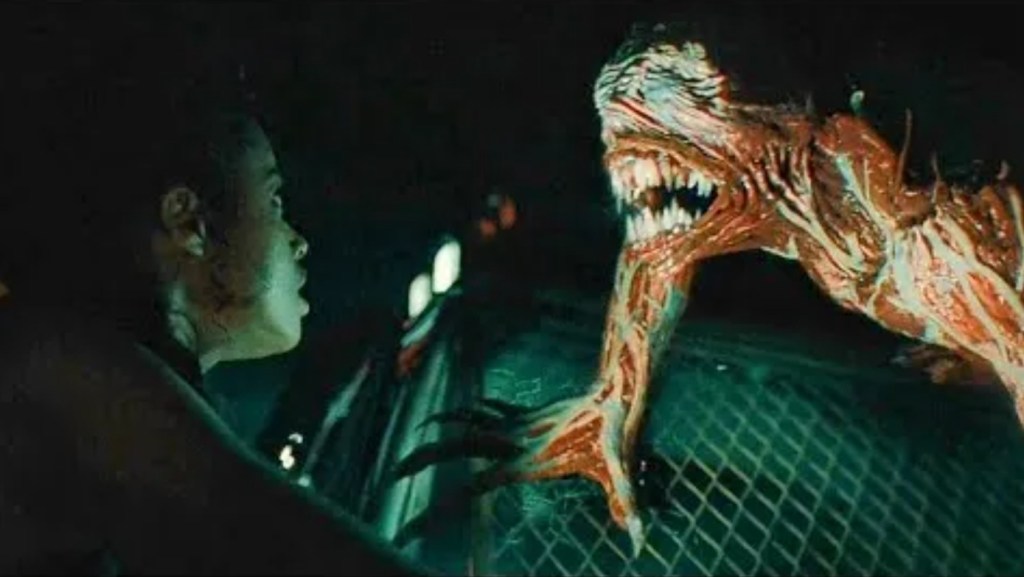 I’ve had many a nasty thing to say about the Mila Jovovich movies (and I’ll say them again too) but one thing they did rather well – besides squeezing its lead actress into all manner of restrictive clothing – is that they gave us a massively varied cross section of Resident Evil’s famously malformed rogue’s gallery and while we were only two episodes in, a couple of zombie hordes, a Cerberus dog and – for some reason – a giant Caterpillar weirdly felt like the show’s producers were being a bit stingy. Well not any more, as Episode 3 not only delivers us a tight, well edited attack from RE’s favorite footsoldiers, the Lickers, but we also get a giant spider which I do believe is a first for a live action RE product. The Lickers are cool, fast, viscous and fairly accurate as their skinless bodies scamper up walls and their prehensile oral protuberances impaled their screaming victims and whisk them off into the dark and its genuinely good to see a more distinctive baddie from the franchise make its toothy debut. The spider is suitably repulsive too as, beyond giving archnophobes a predictable case of the shudders, its extra vile considering its dragging an extra squishy egg sac behind its bloated body and while it’s fairly reminiscent of the Shelob attack from Lord Of The Rings, we still get the juicy sight of it splitting a dude in half like its carving a roast. It may not exactly be highbrow, but it’s shit like this that’s going to inject some much needed life into this show.