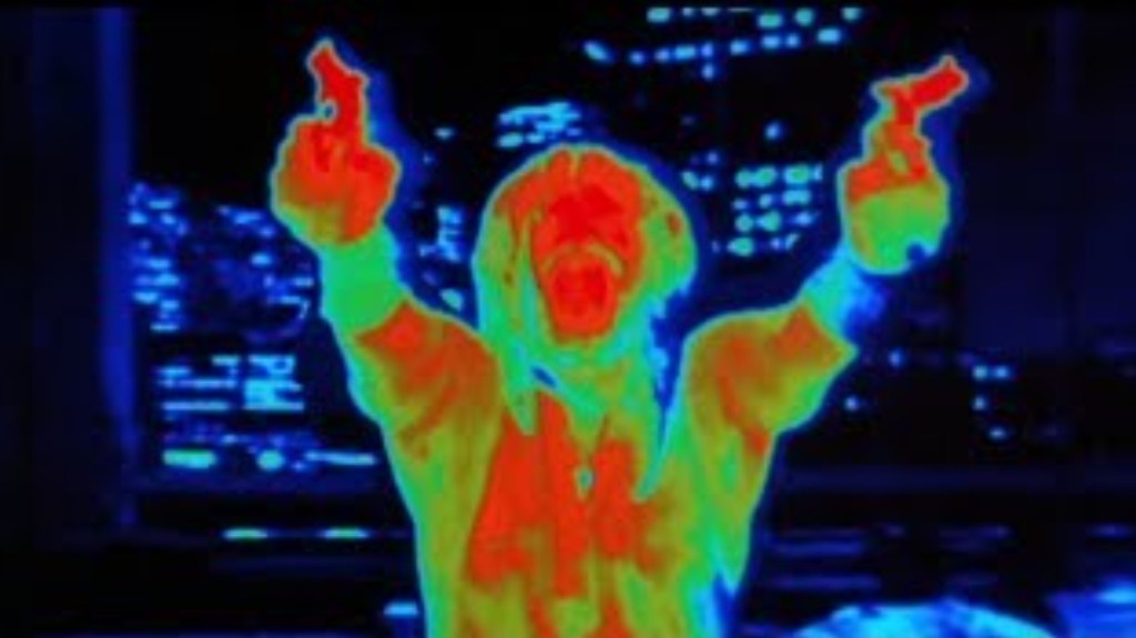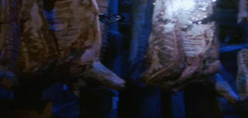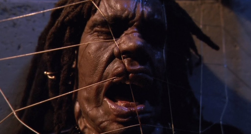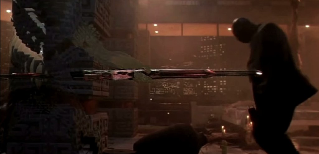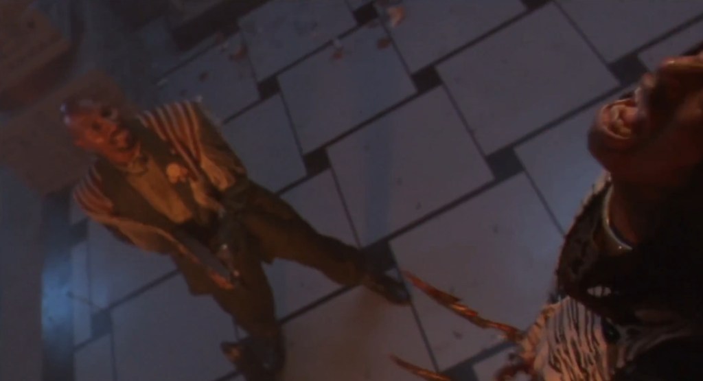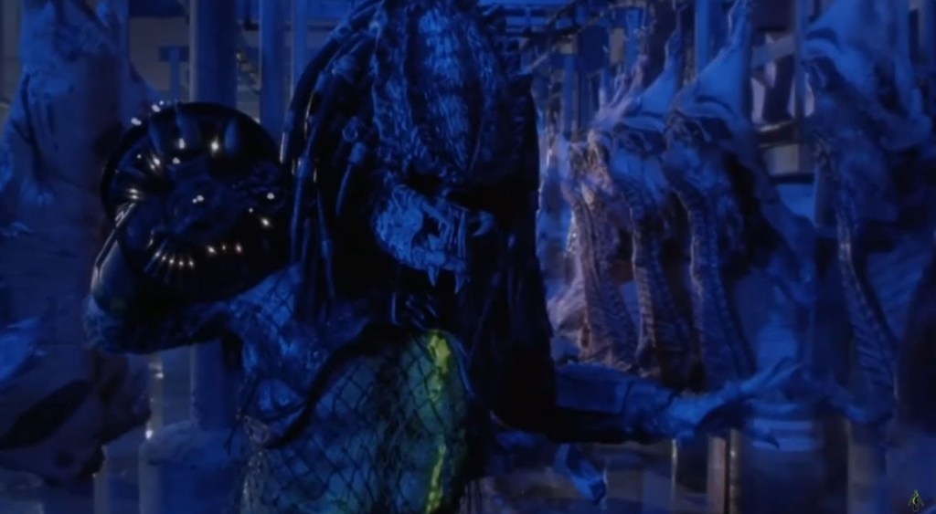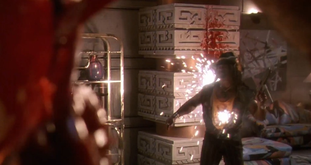 Continuing the aesthetic that every reel of Predator 2 was apparently dunked in a huge, Scarface-sized mountain of cocaine before being run through a projector, the scene is basically the Pred showing off in the most overblown way possible as he racks up style points like they’re going out of fashion. By far the most gnarliest of the death is the poor fucker who gets a face full of net that cuts through his face like cheese wire, but he also runs another through with his fancy, retractable spear and drops another by ruining his dreads with a well placed razor dart. For a movie overdosing on overkill, the erasing of the Voodoo Posse is a nicely brutal highlight.