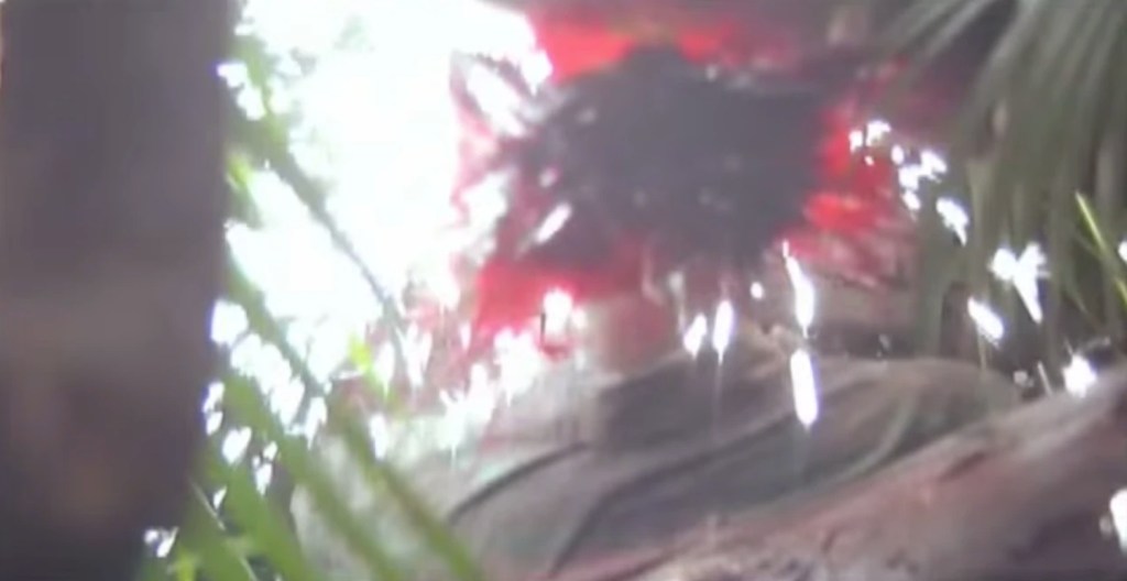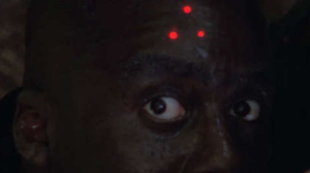 As Mac drags himself under some branches he notices a triangle of three, red dots projected on his arm and has his inner wheels start turning to explain what he’s seeing, the laser dots slowly move from his arm to draw a bead right between his eyes that comprehend a second too late – and then BOOM! the Predator’s shoulder mounted plasma caster spectacularly blows Mac’s brain all over the screen and leaving his double act with Dillan prematurely cancelled.