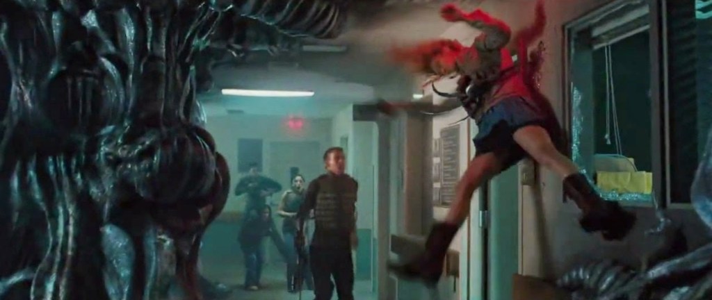 If you were to tell me that Aliens Vs. Predator: Requirem was the absolute nadir of both franchises I can assure you, you’d get no argument from me, but in amongst the forgettable characters and pitch black cinematography (so you have any idea how hard it was finding usable pictures of this fucking scene!?), there’s a bizarrely haunting death that stands out just for its sheer, brutal randomness. Ladies and gentlemen, may I introduce to to Jessie Slazenger, forgettable teen supporting character who inexplicably has the hots for Ricky, the forgettable brother of the forgettable lead. After fleeing a full on Xenomorph invasion of a suburban town, the survivors make it to the hospital where they’re hoping to comindeer a helicopter from the roof of the building before a nuke hits (when it rains, it pours). Meanwhile, the “Wolf” Predator, a member of the species whose day job is apparently to clean up Xenomorph leaks using the most ineffective methods possible (they have massive bombs in their wrist gauntlet, why the fuck does he wander around pouring blue acid on everything?) and has currently engaged the hybrid Predalien as some warrior drones just down the hall from our retreating heros. Hurling his alien, razor-frisbee at his rapidly scattering foes, the deadly projectile whizzes through the corridor and impales the shit out of Jessie, killing her instantly and nailing her to the wall like a floppy-limbed doll.