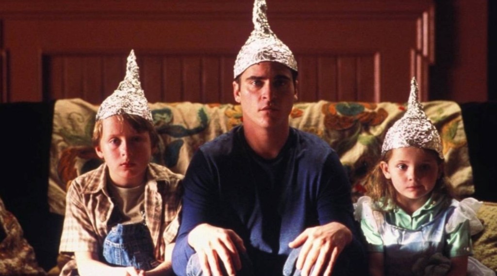 Opening with a title sequence that give composer James Newton Howard to cut loose with an utter banger of a score before the director launches into an invasion film that refreshingly holds back on the Independence Day bombast in favour of touching character beats and gut crawling tension as we see what a slow, stealthy alien infestation looks like from the ground as it effects people who aren’t mathematical geniuses or who can’t fly a jet. As the Hess’ try to go about their business while still internally writhing with the rawness of a recent loss, Graham tries to double down on normality while his predictably precocious kids attempt to make sense of it all and his nice-but-dim brother struggles somewhere in the middle. It’s yet another example of Shyamalan’s gift with character work as you know exactly what everyone’s thinking without anyone saying anything thanks to some magnificent examples of foreshadowing (Witness Graham letting us know exactly how dangerous events have gotten by allowing his family to each choose whatever they want for dinner). The actors more than rise to the occasion and if you can separate the artist from the art, Mel Gibson is a resplendent example of downplaying a character’s emotions, having all of Graham’s grief and uncertainty bubble just under the skin. Elsewhere, Joaquin Phoenix gives wide eyed support as well meaning screw up Merrill and sterling work is delivered by the alarmingly young Rory Culkin and Abigail Breslin and despite the odd appearance of the sheriff of a grumbling member of town, the movie chiefly holds focus on the struggling family unit. Yet amidst all the drama, Signs is surprisingly witty and comes loaded with a fair amount of humor that’s as dry as sandpaper and all the funnier for it – witness Graham’s awkward attempts to be imposing to scare off what he thinks are trespassing kids (“I’m insane with rage!”), or the usage of tinfoil hats to show how weird the alien rumours are getting. There’s even a healthy dose of satire in there too as it toys with the concepts of the family getting all their information from panicked news reports and wild speculation, gradually becoming more addicted to any knowledge they can glean from the events that are rapidly unraveling around them.