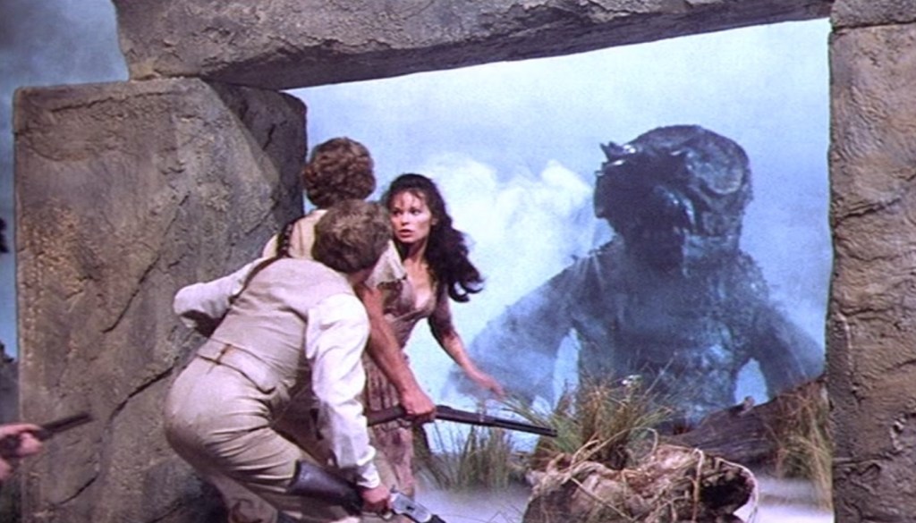 The plot is pure guff and has something to do with the Atlantians originally hailing from Mars (?) and wanting to kickstart what we know World War II in order to create a united scientific utopia under the rule of Hitler – or something, theres a lot of glowy helmets involved and the rest of the film involves the bickering good guys literally wandering from problem to problem until Delphine comes along and aims them in the right direction. But no one came to these flicks for plot nuance – I mean, I certainly didn’t – and the draw from me was the variety of ropey monsters the heroes has to avoid lest they become a pair of legs kicking limply in the jaws of what is quite blatantly an intricate hand puppet that has been rear projected behind the leads as they swipe at it with rifles. To be brutally honest, most of Warlords’ menagerie is actually pretty lame (the sea serpent that attacks the diving bell at the start has a head like a frying pan for some reason), but I’ve always had a soft spot for the Mogdaan and the full sized cephalopod is cool in a rubbery throwback sort of way. To compare them to the peerless work of Ray Harryhausen would be an unfair exercise in futility as pitting undiluted cinema magic vs. glorified sock puppets hardly seems fair; but the beasts look pretty ratty even when held up against the low tech dinosaurs of The Land That Time Forgot.