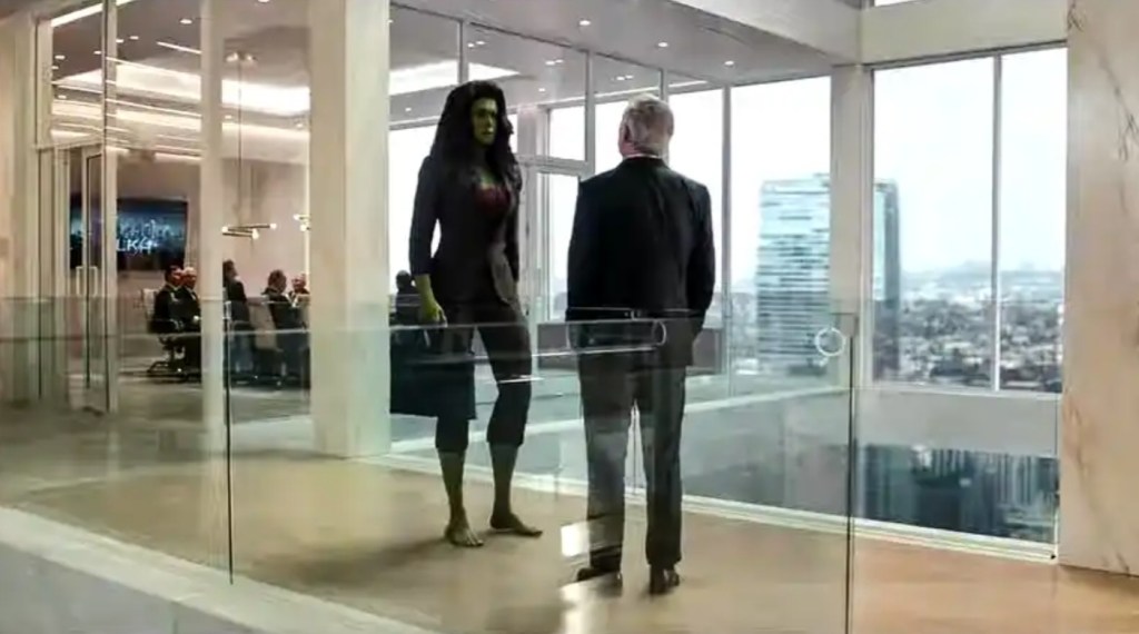 A few niggles raise their heads here and there; the much debated CGI looked far better during the last episode and She-Hulk sometimes looks noticably “cartoony” under certain light while some will no doubt be pissed that the MCU has “nerfed” yet another monstrous juggernaut in the shape of a supposedly reformed Blonsky, but this is only episode 2 for heaven’s sake and we’ve only just begun to pierce the world of Jennifer Walters, where making sure you’re wearing the correct sized clothes for the day ahead is just as an essential task as walloping a bad guy into unconsciousness.