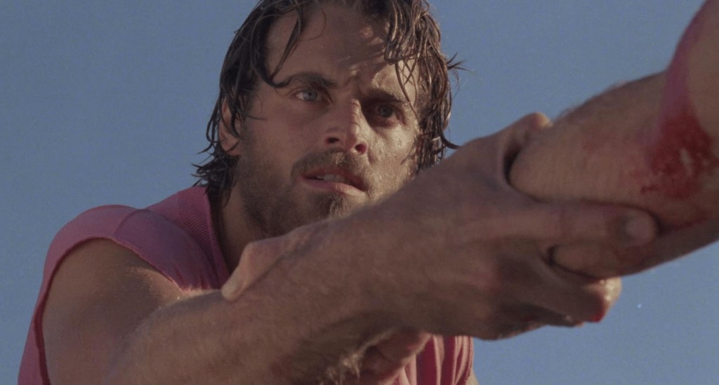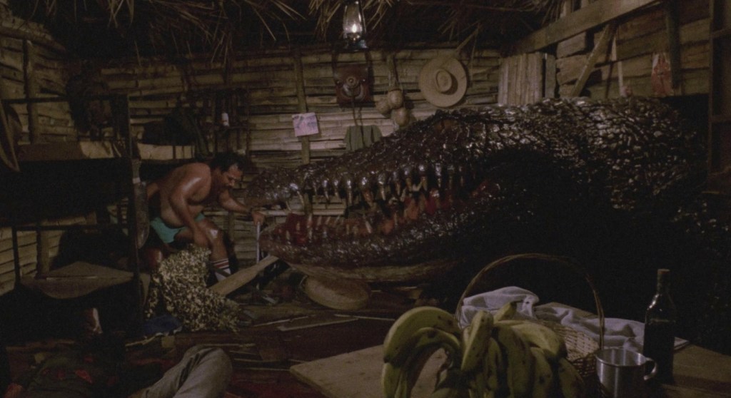 Take the moment when legendary effects man turned director Giannetto De Rossi deems it utterly necessary to have his toothy leading man annihilate a nun and a bunch of screaming kids on-screen and then have no one actually bring this up later despite there being witnesses. Or how about when returning, grizzled, Robert Shaw-esque croc hunter Joe is yanked into the water by the creature only to surface covering blood and dying, but having no noticable bite marks on him anywhere – did… did the croc shiv him to fucking death? Or why the hell during the climax is there a family frolicking on rubber inflatables in the middle of a inhospitable swamp were our titular beast has already given itself IBS by swallowing a bunch of school kids?