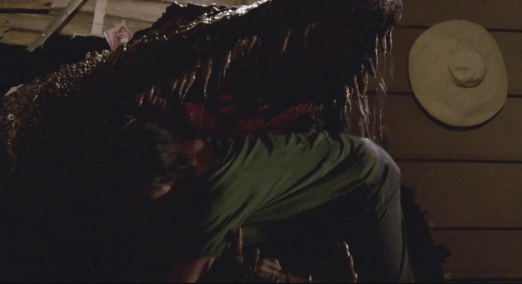 Heading out into the swamp with a guide that’s on Baxter’s payroll, Lisa finds herself being threatened first by the skeevy boatman – and then by the giant reptile who chomps down on his wannabe rapist ass and so Lisa finds herself stranded in the swamps with a trailer-sized predator on the prowl.