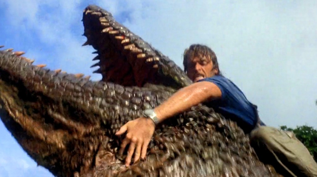 The croc itself is pretty much the exact same, oversized bath toy it was in the original that the filmmakers put centre screen as much as they can (they paid to build this thing so you best believe they’re gonna get their money’s worth!) and the movie seems to delight in showing off how muscular this wobbly predator really is by staging outlandish shit like the animal exploding through the side of a shed, eating everyone inside and then dragging the entire structure into the water just like the sort of stuff Arnold Schwarzenegger would do if he was a big, rubber animal. Still, it looks amazingly ridiculous (remember, we’re only seven years away from Anaconda at this point) and matters aren’t helped much when characters breathlessly describe it as being as big as a house and then we cut to a shot of it looking nowhere near as big as a house.