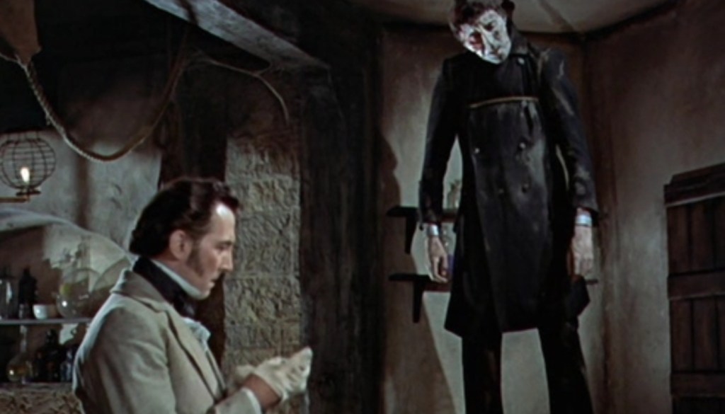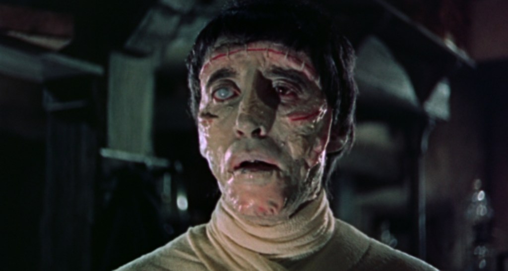 With his various atrocities including pushing and elderly professor off a balcony in order to free up his juciy brain for transplant and locking his bit on the side in the room with his murderous creation when she gets too blabby, the creature is relegated to almost a secondary role, but it’s only fitting considering this is Victor’s world and we all just rent space in it – at least, that’s the way he sees it. While Chistopher Lee’s version of Frankenstein’s monster not quite being as instantly memorable as Boris Karloff’s effortlessly timeless portrayal, he still cuts an imposing, if less tragic, figure as he staggers about the place with a milky white eye and a rather fetching long black overcoat – but like everyone else in the script, even the creature is a mere pawn in Victor’s plans.