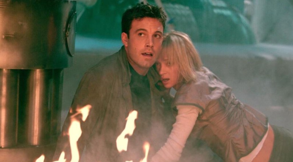 The movie is helped even less by it leads with Ben Affleck having to portray a man who’s job is literally to smugly cheat other companies out of their tech during that period of his career when the world couldn’t fucking stand him and while I quite like Ben Affleck as an actor and a director, everytime he smirks you have to fight the urge to physically dislodge some of his pearly whites while elsewhere, the mouth waters at the prospect of Uma Thurman, still fresh from the bloody triumph of Kill Bill Vol 1, appearing in a John Woo action movie – but to our horror, she attacks the role as if she’s in a romantic comedy as her performance as a biologist is as about convincing as her distractingly coloured tan.