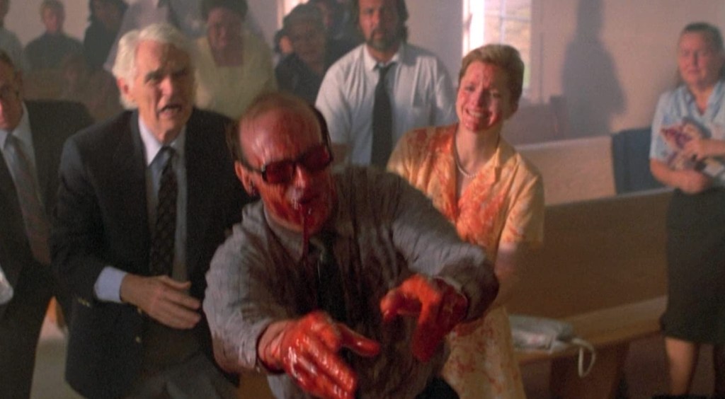 Weirdly staged far less seriously as the rest of the film, the noticably varied deaths may be utterly ridiculous (made even more so by the Omen-style chanting on the soundtrack) but they’re admitted kind of fun. Try not to giggle when a mean old biddy has her raised house lowered onto her while she shrieks “Oh what a world!” in an unhinged homage to the Wizard Of Oz, or when her wheelchair bound sister has her mode of transport hijacked by an evil remote control for a Mrs Deagle-from-Gremlins-style fate that includes a well timed truck, a plate glass window and a bingo hall. Elsewhere, another guy dies from a fatal nosebleed that’s enjoyably icky, another gets stabbed by hypodermic needles while yet another get their neck harpooned by a flying corn stalk – it’s all dumb stuff but by god is it welcome when it comes to actually keeping your interest fixed on this movie – something that’s incredibly necessary thanks to its baffling subplots involving Native American explanations that seem to have wandered in out of Pet Sematary and the money making scheme of Hemingford that involves selling poisoned corn.