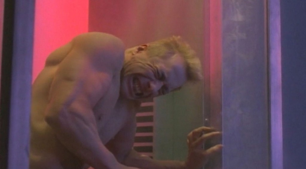 Still, as curious as it is to witness these once great icons metaphorically roll in slop for dollar bills, they’re far more watchable than any of the trio of leads who sleepwalk through the muddled plot like they were shot full of tranquilizers every morning. Of the three, minor 90’s action star Jeff Wincott (brother of Michael and boasting a head so square he could have walked right out of Minecraft) fares the best even though his character’s existence literally makes no sense and Chandra West’s take on Ally Walker’s sarcastic, wise cracking reporter actually has the most to do, tracking Luc down and casually sneaking into maximum security areas like she’s cutting the line at a log ride. However, as bland as they are, Matt Battaglia’s Luc Devereux makes Van Damme seem like the greatest actor of his generation as he blankly drawls his dialogue and fixes everyone with an expression emptier than the cabinet of his acting awards. Yes, he’s supposed to be playing a resurrected super soldier, but at least JDVD sprinkled some charisma in there among the fly kicking (which is also AWOL) and comedy nudity (which decidedly isn’t). In fact watching scenes of Victoria trying to get her slab of undead himbo to be more human is utterly excruciating as she uses the kind of self-help shite middle-aged white women usually have as wall decorations in their kitchen. “Laughter is life”? Fucking shoot me now.