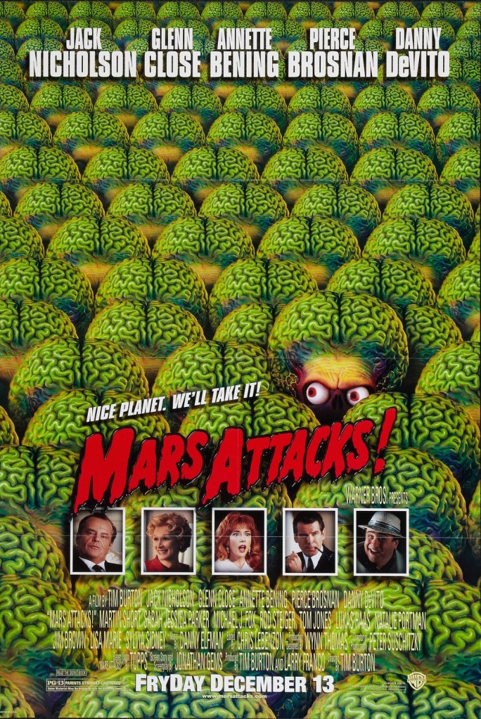 Sometimes satire ages like wine, waiting patiently for our tastes and perceptions to catch up so we’ll eventually savour its matured taste. Mature is hardly the operative word to describe Tim Burton’s raucously anarchic, alien invasion blowout, Mars Attacks!, a willfully ridiculous film that charged headlong at a blockbuster audience used to seeing Americans emerging as brave, competent heroes in the face of total annihilation from an extra terrestrial threat and predictably was met with the cocked eyebrow of confusion.