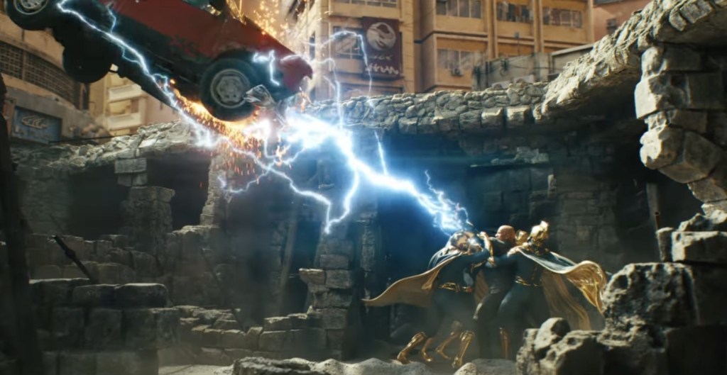 Seemingly made for those fed-up with super-hero movies trying bold new things, Black Adam whisks us back to the days of 2013 when superhero movies could trash large sections of an entire city and conveniently just not mention the devastating cost of causally punching a man through a populated building. On one hand it’s perfectly understandable considering the DCEU has been scrabbling for some steady ground to build a foundation on for years and it’s genuinely pleasing to see the numerous links to other, past movies such a lavish adherence to Shazam’s established lore (hello again to Djimon Housou’s wizard), the appearance of Viola Davis’ Amanda Waller and a further, seismic cameo lurking during the post-credits sting. Also promising is the addition of some more DC mainstays which expands the overall hero roster nicely after years of solo adventures and villain teams. However, for all of Black Adam’s good intentions (the movie I mean, Black Adam himself is famously short or any such intentions), this timely bout of connective tissue often refuses to make any logical sense. Why is the message of the movie that Black Adam maybe shouldn’t kill when we’ve literally had an unending stream of movies featuring Superman, Batman, Wonder Woman and Aquaman slaughtering whomever the hell they want, whenever they want? Similarly, if the whole point of either version of Justice League (Whedon or Snyder: pick your poison) was that they formed to fight Steppenwolf because there want anybody else – however, Black Adam hints that the Justice Society have been together, smiting worldwide problems for quite a while which is somewhat contradictory, unless they all took a gap year around the time Supes died.