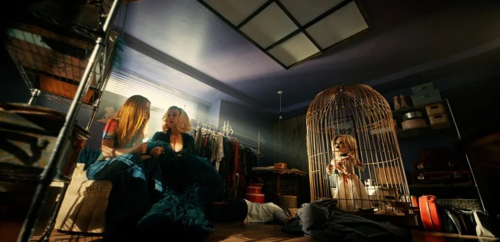 After last week’s belter of a detour into the realms of a meta murder mystery that finally let Jennifer Tilly’s scene chewing Tiffany Valentine take centre stage and reintroduced Chucky’s gender fluid siblings Glen and Glenda back into the mix, Doll On Doll had a lot to live up to. After all, this fifth episode has a lot of ground to cover as we round the halfway mark and sprint for home and we now have quite a potentially unwieldy number of cast members to juggle with an incredible amount of backstory to negotiate. Somehow, someway, the episode actually manages it by taking the trick the show used in Season one by taking the various players from over thirty years of Child’s Play continuity and teaming them up into little groups and impressively doing it in a single episode. So in one camp we have the group of Nica, Glenda and Kyle that was formed last episode who have united to take down Tiffany who take a much needed break here, allowing us to spend more time with our other groups as they form and break. For example, our core gang of Jake, Lexy, Devon and Nadine are fracturing due to everyone’s varying opinions on the self proclaimed Good Chucky who proves himself to Jake by defeating the muscled Chucky in slightly awkward combat (it’s a TV budget, so we’ll give it a pass), but his need to forgive the red-headed little fucker is alienating his friends and further widening the schism between him and Devon who believes no Chucky should be left alive. However, it’s to the credit of the script, the small battalion of puppeteers and Chucky actor Brad Dourif that you genuinely feel for this ex-killer doll whose accessories now come with a conscience. The final straw comes when Jake and Nadine baptise the doll, cleansing him of his past sins and while thread of a good Chucky, while having the full potential to be as cringe worthy as a forty five year old’s Tiktok account, has proven to be a massively interesting shift in the franchise’s status quo.