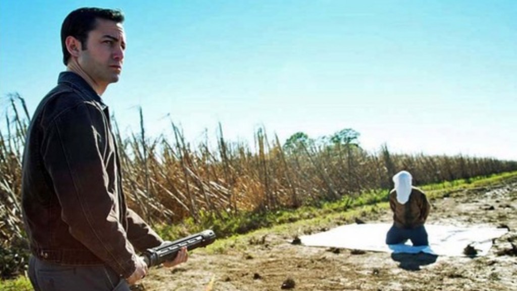 Sent back in time, bound, hooded and with gold bars strapped to their backs as payment, these poor bastards are immediated blown away upon arrival by hired executioners known as Loopers who have embarked on a contract that ends in 2074 when they will eventually be sent back in time themselves to have their “loop” closed with the business end of a shotgun.