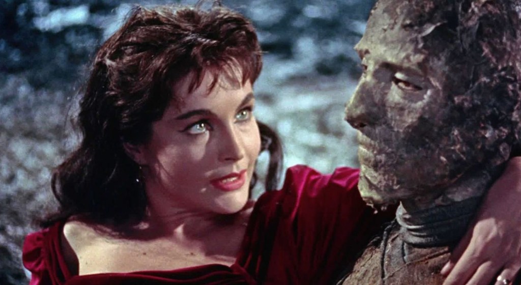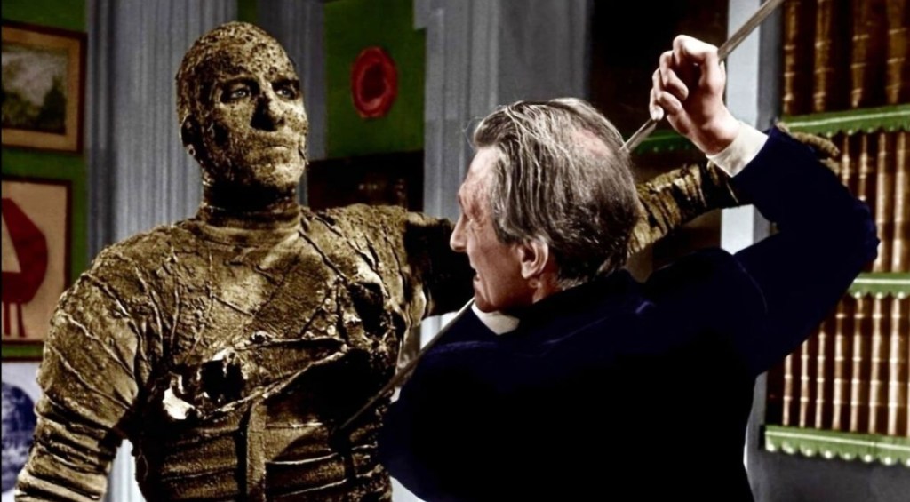 After retro-fitting and updating such classic characters as Frankenstein and Dracula with more modern (for the 50’s anyway) sensibilities, it was a shoo-in that Hammer Films would turn their attention to the rest of the monstrous squad made icons by Universal nearly twenty years earlier. So after a Dracula movie and two Frankenstein flicks, both infused with retina searing colour, it was only natural that the studio cracked open the sarcophagus and dragged out the Mummy for a bit of an airing – however, there was a slight issue. While Dracula is a pro-active blood sucker and the Hammer Frankenstein movies wisely focused more on the continuing mania of its titular Baron, whichever way you slice it, the Mummy was either always mindless, lurching muscle for an Egyptian sect leader or a wrinkled schemer, plotting supernatural “accidents” to further his fortunes with neither really being as effective as some of their inhuman stable mates. So which Mummy would Hammer unearth to break that true curse of the pyramids: the unfortunate fact that the monster is a little B-list.