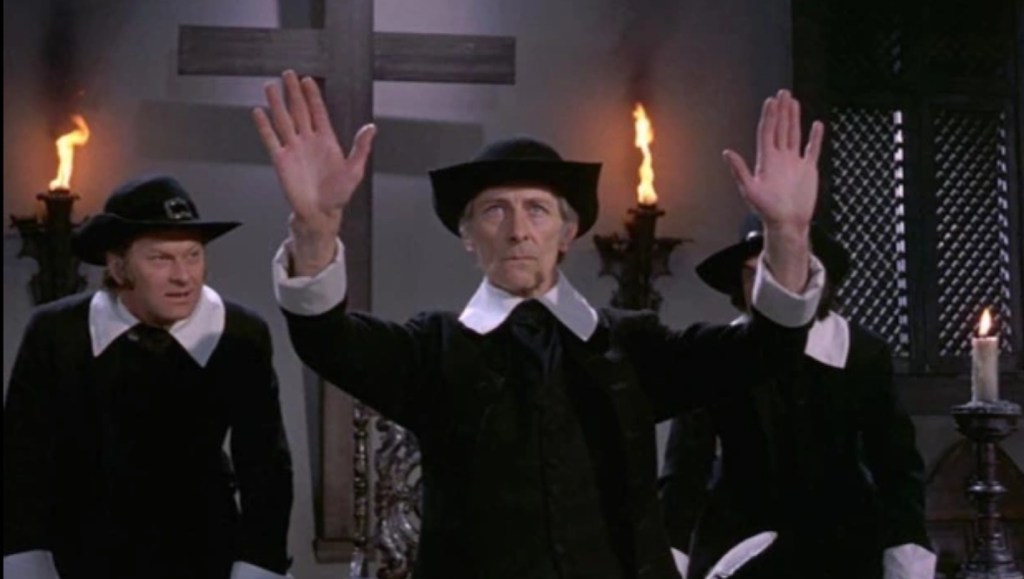 It’s the 17th century and the hollow cheeked puritan Gustav Weil travels across the countryside with his band of god fearing fanatics, burning any wayward young woman he finds at the stake for the perceived crime of witchcraft. Into this tense atmosphere come the Gellhorn twins, recently orphaned and now placed under the care of their tyrannical uncle who practically sees everything as a sin, however, while one twin, Maria, is virtuous, shy and kind, her sister, the far more forward and cruel Frieda, rails against her new life, despising her surroundings and longing to meet the enigmatic Count Karnstein, a man who regularly butts heads with their uncle for having a voracious sex drive that would make Russell Brand’s legendary bed hopping exploits seem positively shy in comparison.