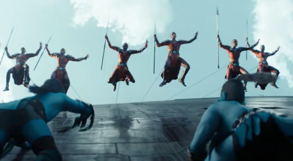 As I mentioned earlier, Phase 4 has been a hot bed of grieving, pain and ultimately healing as the world continues to attempt to get a grip in the wake of the Blip with such characters as The Scarlet Witch, Thor, Bucky Barnes and Hawkeye all going through various stages of emotional trauma to emerge on the other side and those of you who feel that maybe Marvel has over compensated for that better hold on – because we’re not done yet. Immediately tackling the loss of Boseman by dropping us directly into T’Challa’s death and subsequent funeral, director/writer Ryan Coogler chooses to make his near-impossible task to wrestle (often uncomfortably) with the nature of grief and it’s long lasting effects on the loved ones left behind after a death. While Queen Ramonda and General Okoye (Angela Bassett and Danai Gurira, both excellent) continue to do their duties while the loss still ripples across their beautifully expressive faces, Letita Wright’s Shuri flounders, unable to move on as her science-skewed brain has never really allowed her to fully embrace the traditions and beliefs shared by her people. It’s all hefty, raw stuff for a superhero blockbuster, especially one released in the wake of the fourth wall shattering She-Hulk, the classic horror shenanigans and the merciless chaos of Thor: Love And Thunder, but Coogler holds his course, steadily winding his themes believable through the motives of his ensemble cast and for the most part, Wakanda Forever is a thoughtful examination of loss that still has plenty of room for explodey spectacle.