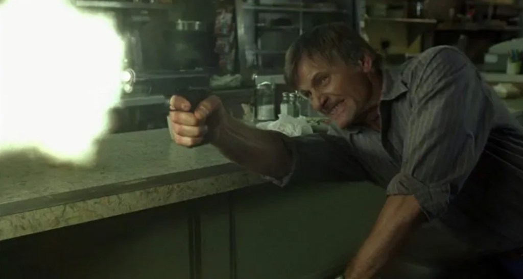 Tom Stall is a simple man who owns a diner in Indiana and who has an impossibly picturesque family containing the usual loving wife, a teen son who is being bullied and a young daughter smothered in blonde curls. However, his content existence is thrown into a state of upheaval when one evening, just before closing, two very violent men enter with the intent to rob the place while simultaneously racking up a large bodycount simply for the hell of it. However, their rampage is halted when the seemingly mild mannered Tom suddenly springs into action and kills both men with alarming ease, pumping one villain’s chest full of lead before blowing the other one’s face all over the tile floor despite taking a knife to the foot.