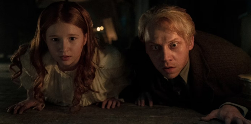 However, a lack of genuine scares isn’t even the main issue with Dreams In The Witch House as its main sticking point is the lead character of Walter Gilman, a driven man consumed by the death of his sister who is played with wild-eyed panic by Rupert Grint. As tough as it is not to simply see him as an adult Ron Weasley who’s fallen on hard times while suffered a spectacular LCD flashback, the script does him no favours at all by giving us no real time to get to know him as a person as he melodramatically runs/staggers from scene to scene in seeming in the grip of a constant state of panic. While driven and obsessed characters driven to the edge of reason were usually the bread and butter of Lovecraft’s stories, Grint’s streak of white hair and haunted stare ends up being more irritating than heartbreaking as he’s less a empathetic character than an hour-long whine.