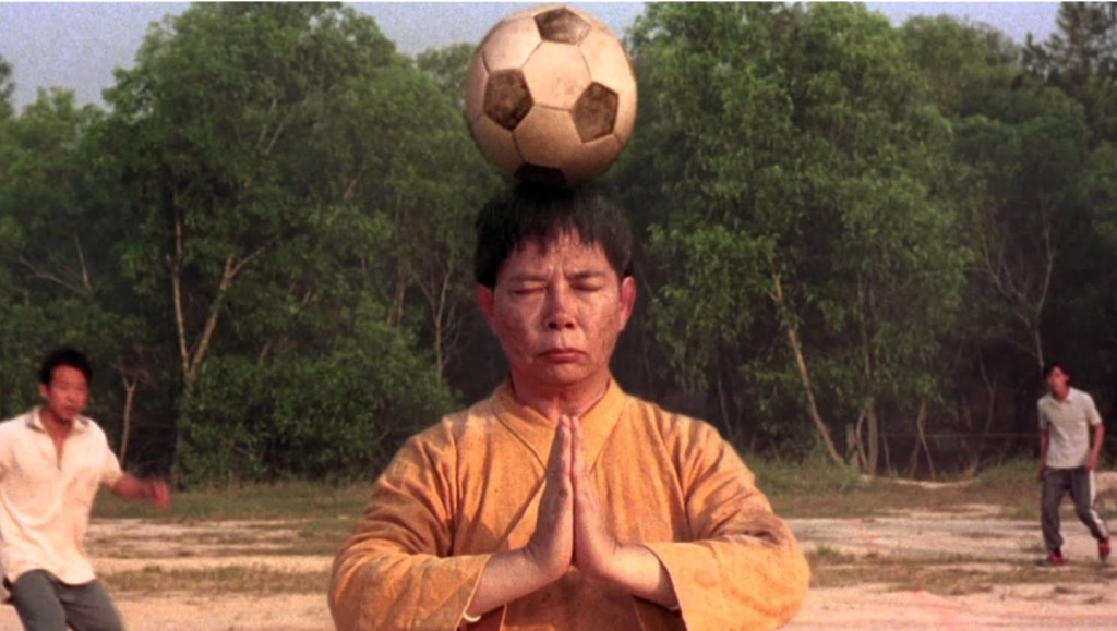 Sing is a master of Shaolin Kung Fu (namely the Mighty Steel Leg style) and despite his destitute appearance and lifestyle, he wants nothing more to spread the word and teachings of Shaolin to the world in general to make their day to day lives easier (parallel parking would be a cinch if you could just slide your car in with a focused punch) and he seemingly gets his shot when he is approached by disgraced and lame, former football star “Golden Leg” Fung. Witnessing how hard Sing can boot a drinks can, Fung wishes to assemble a team to combat his former team mate, Hung who now owns the amusingly named Team Evil (hey, at least they’re honest) and so Sing gathers up his former Shaolin brothers who all have since fallen on epically hard times. Despite all having distinct Iron Head spends his day getting abused by his boss in a dive bar, Iron Shirt is a stressed businessman, Empty Hands is essentially homeless, Hooking Leg frets about his male pattern baldness, while Light Weight, the youngest, has become a something of a noticable heavy weight.