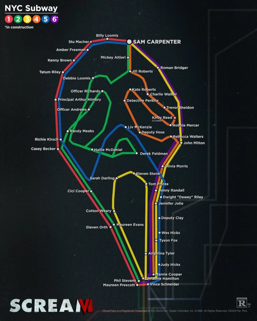 All six films in the franchise are represented by a line on the map, 6 being labelled as under construction, with the character names of the victims in the place of stops. The one exception is Sam Carpenter, Melissa Barrera final girl character who survived fifth film, who is shown to be the nexus for all lines. Another point of note is that Kirby Reed is marked as closed. Kirby was presumed dead after the fourth film but Hayden Panettiere is reprising the role on the new installment.