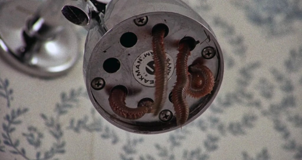 Be it the unintentionally funny close ups of the worms as they shriek like squealing pigs in a brave attempt to make earthworms scary, or the or the sight of a corpse with his ribcage packed full of the little critters. There’s even a couple of legitimate jump scares in there thanks to either the worm-ridden Roger (sterling early work from makeup effects legend Rick Baker) leaping out at people or a moment when someone opens a door to reveal a wormy wall of death lurking behind it. In fact the moments where worms ooze out of a shower head while an oblivious would-be victim fiddles with the taps, or the final scenes, where a house gets completely overrun by a literal sea of killer worms, will no doubt trigger an unhealthy amount whatever phobia the slimy shits fall under and it’s here that Squirm undeniably nails the bullseye. Complain about the cruddy acting, grotty production values and nonsense concept all you want, but what exactly did you think a killer earthworm movie made in 1976 would look like, anyway? This is an unabashed cult movie that puts all of its ropey efforts into being as odd and off-beat as it possibly can with a plot that’s a laughable as it is (yes) squirm inducing.