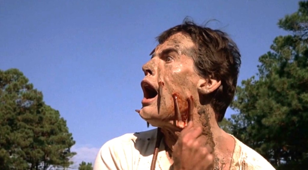 A truly odd slice of American gothic that wears its raggedy production values on its tatty sleeve, you could hardly describe Squirm as a “good” film, and yet, there’s something about its imperfect little form that’s perfect for the midnight movie crowd. Loaded with bizarre characters with accents so southern they make Scarlet O’Hara seem like she’s from the Bronx, even if it wasn’t a movie about killer earthworms, Squirm would still have been marked out for cult notoriety for its weirdo levels alone. Not one of the characters is even remotely appealing with lead character Mark having all the hero capabilities of a cold lobster thermidor and Geri looking like she literally woke up in a ditch every morning. Still, they’re Clark Gable and Vivian Leigh compared to the rest of the cast who takes the Lynchian townsfolk seen in the script and uses their acting “skills” to take them to another, laughable, level. I honestly have not clue as to what is supposed to be up with Jean Sullivan’s portrayal of Geri’s mother, but whether she’s supposed to be suffering mental issues or flying off he tits on some sort of gnarly narcotic, but her choice of line readings are utterly awful in the best way. The same could be said of Fran Higgins’ Alma, a teenage burnout whose sense of humour is as off colour as her teeth and who looks every bit as ratty as you’d expect of someone who voluntarily lives in a place called Fly Creek.