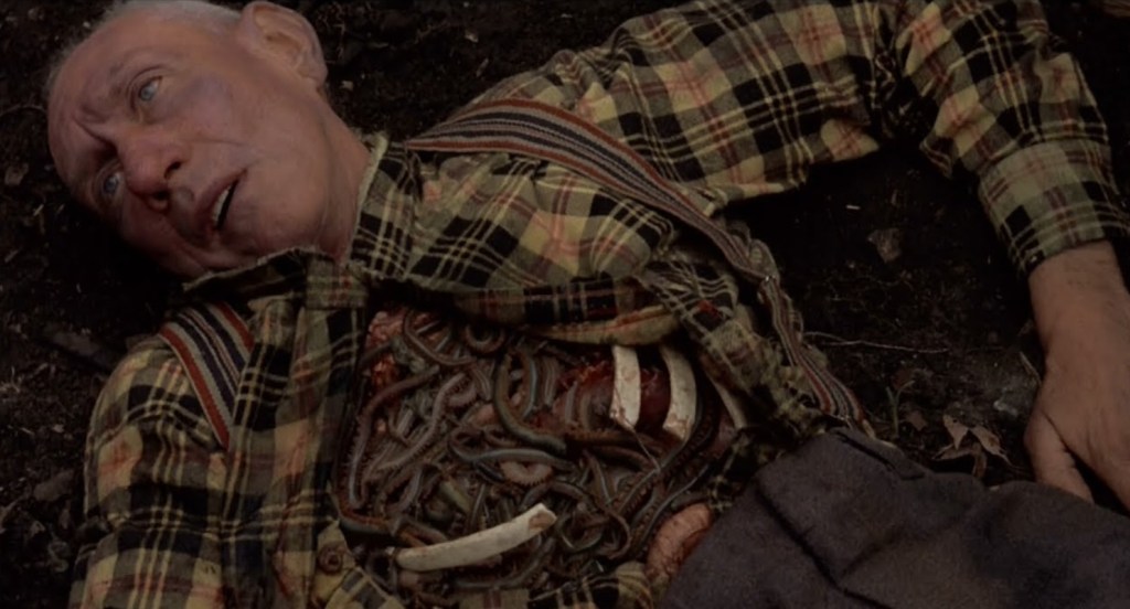 As night falls and the worms come out in force to George themselves on any human beings they can find, Mark and Geri not only have to survive against this wriggling, wall of death, but a deranged Roger, who’s agonising, wormy facial has driven him completely insane.