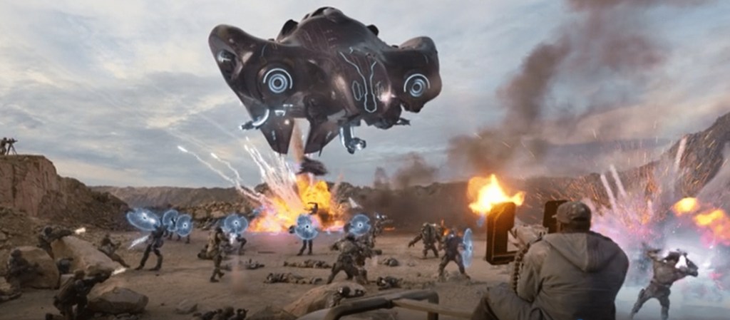 But now we turn our attention to that stonking action sequence, which is exactly the live action battle I always hoped we’d get the second I heard that a Halo tv series was on the way. It’s literally all here as episode director Jonathan Liebesman (Battle: Los Angeles) crams in as much Halo shit you could ever hope to see as Banshees scream over the battle field as Warthogs roar through the dust and explosions and we get the Covenant attacking in force. Not only do we finally (FINALLY!) get the babbling Grunts and energy shield waving Jackals dropping into the firefight, but we also get a surprising, first view of the hulking, ape-like Brutes first seen in Halo 2. The in-action detail is crisp, clear and deeply satisfying, with even a couple of genuinely cinematic, fist pumping moments of awesome occuring at regular intervals, usually involving Master Chief doing something devastatingly cool like reclaiming a Warthog from a joy riding Grunt with a terse quip or aiming a careening Banshee like a missile while tenaciously clinging to the side.