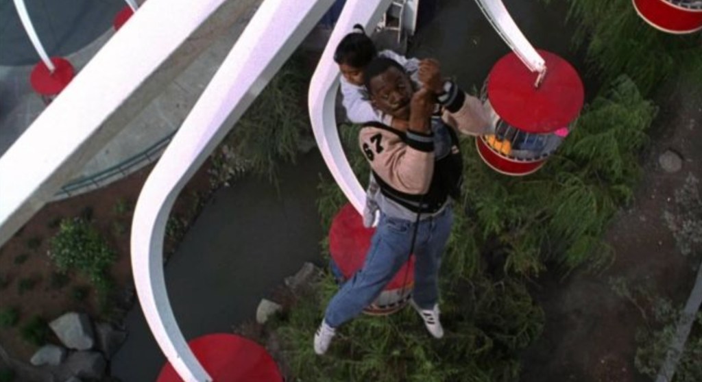 To be fair to the star, he genuinely looks engaged for the most part(for 15 million dollars he’d fucking better be) and while his energy is noticeably less wild in this one, his frantic mugging doesn’t feel like he phoned it in as much as other actors probably would have. Judge Reinhold’s Billy Rosewood also is still fun to be with, but Hector Elizondo and Theresa Randle just end up hovering around the outskirts of the plot, waiting blandly for the script to give them something to do as if it was an overdue bus.
