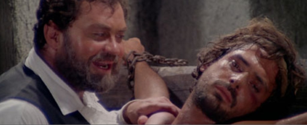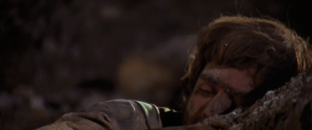 It’s fairly grim stuff and will no doubt probably offend more unseasoned viewers with its unrepentant representations of animal abuse, homosexuality, mental illness, racism and male rape; but the counterpoint is staggering simple – it’s a Django film, it’s supposed to be brutal and upsetting. In fact its pre-Lynchian trappings often edge over from the common Western, takes a memorable trip through the realm of the horror genre and nearly comes out the other side as a full blown art house flick as it heaps on the haunting imagery from the very first image: that of the Stranger’s hand rising out of his own shallow grave. It gets trippier from there, from Oaks’ absurdly karmic death where people are literally pulling gold from his wounds, to the sight of a Native American getting graphically scalped to the poetic death of a character who fights his way through a fire to save the gold only to find that it’s melted in the heat as it pours all over him. Of course, it’s not just the brutal violence that sticks in the memory, no. Take Mr. Sorrow’s truly out-there method to torture information out of the Stranger that sees him crucified in a loin cloth and random savaged by iguanas and bats (obviously fruit bats, but who’s counting). Quite why Questi chose to suddenly slam a full biblical reference in this particular scene is something I’m not sure I’m qualified to answer (I’m not a therapist), but it sure is memorable.