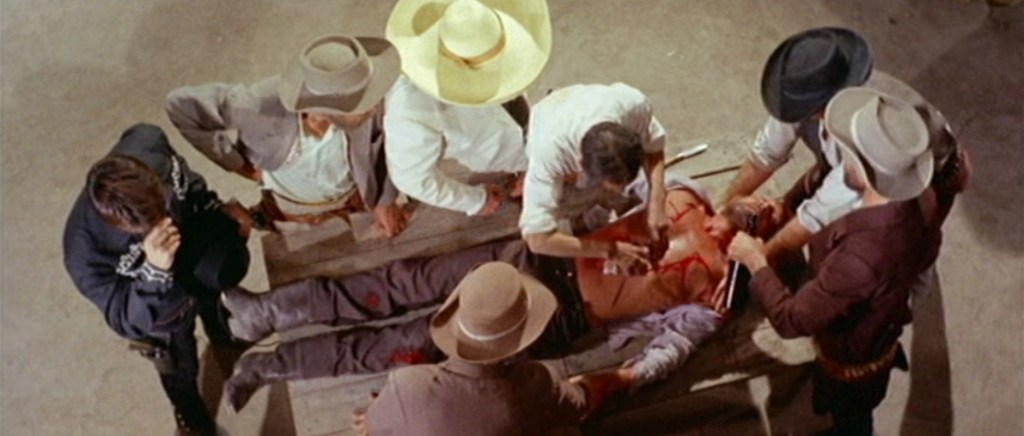 There’s a lot to unpack while watching Django Kill… as even by 1960’s standards it packs something of an antisocial wallop, but while there’s numerous instances of distressing storytelling here and there, it’s also what makes this Western stand out to such a stylish degree. Riffing on the kind of horror-themed imagery usually found in Italy’s Giallo genre, the Stranger’s dreamlike wander through a town seemingly fueled by bitterness and cruelty deals out many memorable moments that tear through your psyche like a golden bullet. Severely wounded by the Stranger’s bling-tinged fullicade, Oaks violent succumbs to his wounds when those in attendance discover exactly he’s shot full of and start greedily tearing at his bullet wounds to get the riches within. Meanwhile, watching this act of gruesome greed and getting oddly aroused is Flory, Templar’s conniving bit on the side who is tired of being his mistress a urges her lover to make a desperate attempt to secure the hold for himself at the expense of his innocent son, Evan. Elsewhere, the sanctimonious Alderman also plots and schemes while his wife is imprisoned in an upstairs room, driven half-mad by a lifetime of gas lighting and peering out at this shithole town through the iron bars on her window – but even these shockingly poor examples of humanity are dwarfed by the malevolent excesses of the aptly named Mr. Sorrow. Essentially what you’d get if Sergio Leone cast a psychotic Nathan Lane to play a Bond villain, Sorrow is simultaneously as genuinely fascinating as he is potentially offensive, hiding the flamboyant cruelty of the actions of him and his men (all amusingly dressed in matching outfits) behind the rationale that their harrowing misdeeds are the actions of truly masculine men, this also includes the implied sexual assault of the character of Evan who is captured to lure the location of the gold out of his father, but who takes his own life in the wake of the attack.