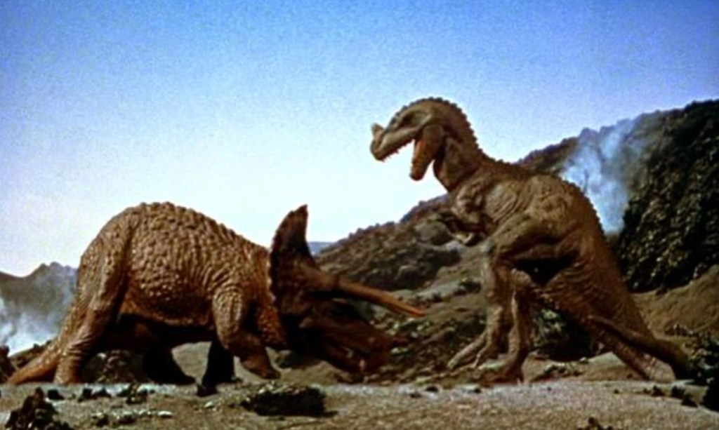 However, while it’s fun and easy to mock old movies that play fast and loose with historic facts, to be too smug is to miss something of an important fact. As brutally ludicrous as One Million Years B.C is, it’s also something of a kick ass fantasy film that features all the screaming monsters, oily torsos and gratuitously tacked on chick fights you could possibly hope for. Adding inordinate amounts of class to proceedings is the always flawless work of Ray Harryhausen who not only helps create a tangible skyline of turbulent volcanoes and angry looking filters, but also gives us some top-notch, pre-Jurassic Park, dino-related mayhem that ranks among some of the best he’s ever created. Not only do we have Tumak and the shell tribe convincingly fight with and pull off a truly awesome kill-move on an Allosaurus that in actuality was only about a foot tall, but we also get a stonking Triceratops/Ceratosaurus smackdown and some hot pterodactyl action that no doubt went a long way to causing numerous generations of kids to fall unequivocally in love with dinosaurs.