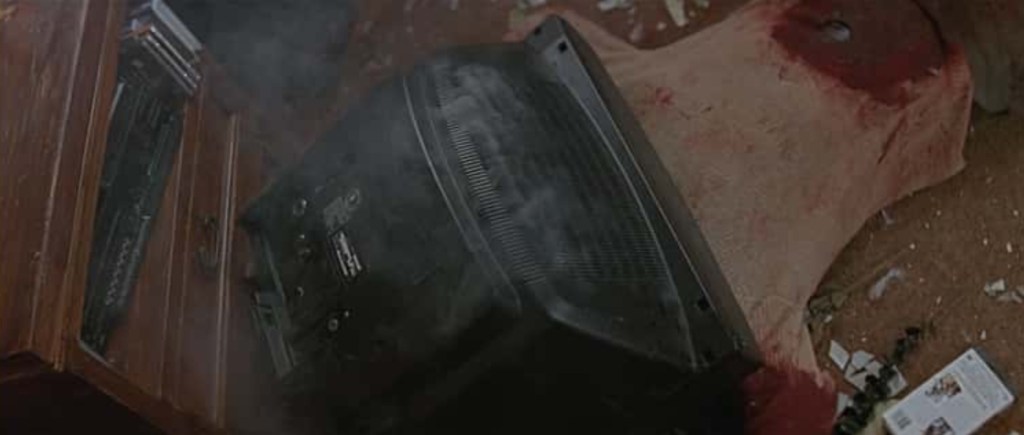 Fighting off severe blood loss caused by his overzealous partner in crime going a teensy bit too far by “faking” a knife attack for a handy alibi, Stu nevertheless manages to get his shit together long enough to channel that dufus energy into a berserker rage when victim-to-be Sidney Prescott manages to flip the script. However, the lanky streak of piss has obviously under estimated both Sid’s survival skills and exactly how much blood is still left in his body and is swiftly overpowered, takes a knee to the crotch and then has a sizable television set tipped onto his screaming face for his troubles.