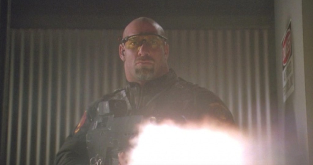 Loaded with so many plot inconsistencies the entire, muscle bound cast would no doubt pull a hernia if they tried to lift it, Universal Soldier: The Return is a goldmine of awful dialogue, nonsensical scenes and logic-free action thanks to the directorial feature debut of prolific stuntman and seasoned second unit director Mic Rodgers who proves he can shoot an action scene as good as anyone (the opening jet ski chase, featuring jumps, crashes and a dude water skiing with his feet, is a legitimate corker), but he struggles when trying to coax a single, recognisable, emotion out of his beefy cast. JCVD’s Devereux somehow has less emotions here than he did as a blank-eyed automaton in the first film, although he tries to draw some pathos from hugging a framed photo of him and his dead wife, even though their expressions look like they’re posing for a passport photo. Elsewhere, impossibly ripped Michael Jai White (Spawn) gives us a decent villain, but S.E.T.H. may actually be the dumbest, evil A.I. cinema has ever seen (He wants to conquer the world by taking himself out of the computer realm and commanding, like, fifty dudes), but the most cringe worthy shit is left to wrestler Bill Goldberg’s henchman, Romeo. Simply seeing if his WCW schtick works in a Hollywood movie (it doesn’t), Bill’s gimmick is to constantly keep getting flattened by various things only to dust himself of like Tex Avery on literal steroids while growing his instantly forgettable catchphrase “I hate that guy.”. Still, while this utterance may not be a “I’ll be back.” it’s still head and shoulders above some of the other utterances heard by the rest of the cast.