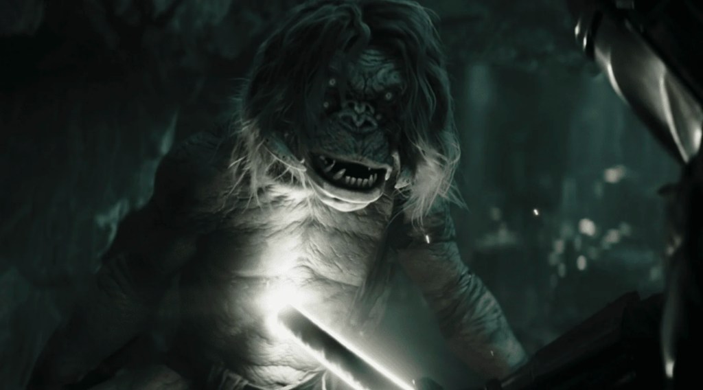 Out comes the Dark Saber for the first time this season and Din still hasn’t mastered fighting with it. He is sluggish and clumsy with it as he struggle with the weight. You get the feeling that if he wasn’t using it he would have torn through these creatures with ease. With them defeated he continues his decent with Grogu following along in his new pod. It’s not long until Din, who bear in mind is meant to be a master at what he does, falls into another trap. This time he is caught by a vampiric, one-eyed, General Grievous type who has the ability to detach its “head” and move between bodies.