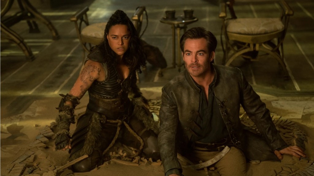 The cast certainly helps, with Chris Pine’s lead thief exuding waves of charisma at a factor of Captain Kirk despite him side-stepping any overt action completely (aside occasionally bonking someone over the head with his ever-present lute), leaving the real rough stuff to Michelle Rodriguez’s vastly entertaining Holga who makes you wish she’d made more films like this instead of constantly popping up in Fast & Furious sequels. Elsewhere, Justice Smith and Sophia Lillis provide the same kind of comedy angst and isolation they respectively brought in Bumblebee and I Am Not Ok With This, while a magnificently smarmy Hugh Grant fittingly steals all the best lines as his con man made good. However, the movie’s best moments arguably come from Regé-Jean Page’s epically straight do-gooder, who turns what could have been a one-mile character into something of a comedic secret weapon without actually doing anything overt funny whatsoever.