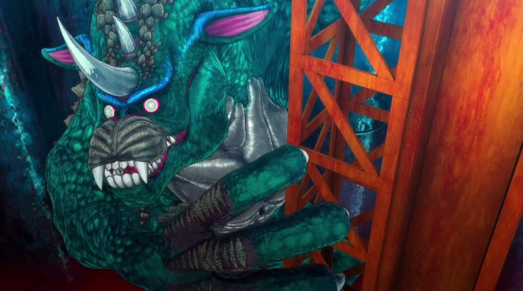 As this very busy episode hears the starting pistol, it streaks away from the starting blocks by immediately dropping us into an ocean stained red by the crimson dust all these violent, monster life-forms seem to have in common as some fishermen almost fall foul of the huge, snake-like animals kaiju fans will recognise as Manda. As the coast guard risks their lives to weave their rescue copter in and out of their writhing bodies, we switch to join Yun, Haberu and reporter Kai as they try to track a hefty, spiked, tank-like reptile named Anguirus as rampages through the woods and heads for a nearby golf-course. However, as Yun theorises that the horned monster has the ability to predict the future by vibrating it’s spines and therefore can accurately deflect gunfire, yet more issues are arising around the world.